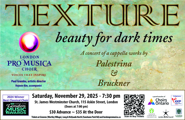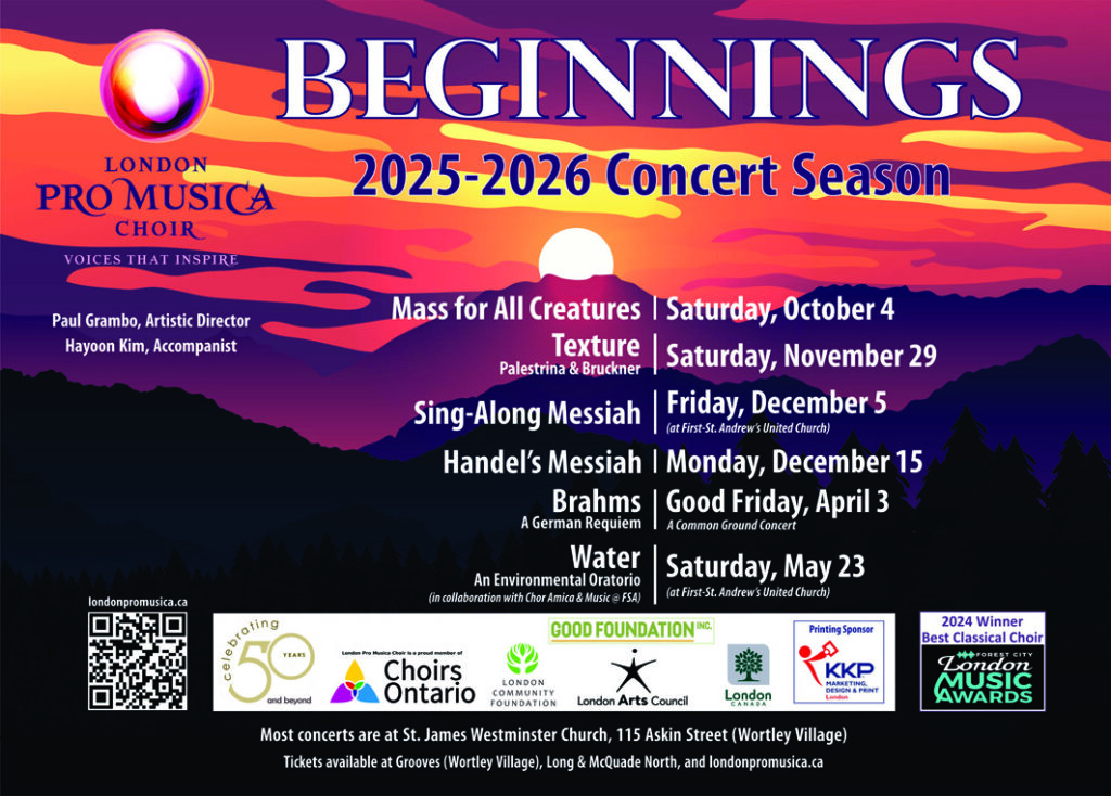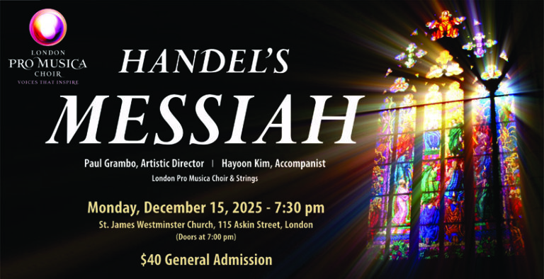 2025 closes with two performances of an LPMC favourite, Handel’s Messiah. As in previous years, we will collaborate with the community on a Sing-Along Messiah at First-St. Andrew’s United Church and will feature strings and soloists from the London area. Then we will perform a Messiah Highlights concert in St. Marys on Saturday, December 13, 2:00 pm. And finally, we will wrap-up 2025 with our own performance of Messiah, featuring professional soloists and strings at our home venue of St. James Westminster Church in Wortley Village. This is an audience favourite, and we are thrilled to be bringing it back as part of our 2025/2026 season.